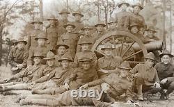 ARMY TRAINING CAMP "FORREST" AT CHICKAMAUGA BATTLEFIELD WITH THE 39TH INDIANA INFANTRY REGIMENT MONUMENT IN THE BACKGROUND, US ARMY CORPS OF ENGINEERS SOLDIERS POSE IN UNIFORM WEARING U. ARMY ENGINEER CORPS COLLAR DISKS ON AND AROUND A CIVIL WAR CONFEDERATE.During WW1 at Chickamauga Battlefield, the War Department established 3 camps - Camp Warden McLean, Camp Greenleaf, and Camp Forrest. Camp Forrest was the smallest of the 3, and served primarily as a training hub for engineers.
