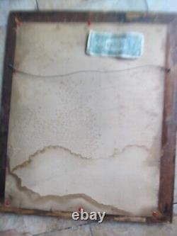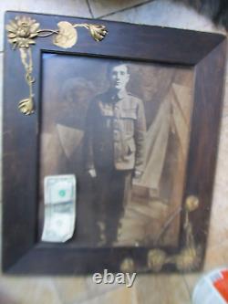 Done from an original wartime photo. Probably done as a memorial to him, possibly because HE DIED, EITHER DURING THE WAR OR AFTERWARDS, E. DURING THE 1918 FLU EPIDEMIC. This was often done if the soldier was no longer there, as a remembrance and framed memorial / shrine to him on the wall. Could also have been simply a fancy memorial dedication to his service. Great pose, shown wearing uniform, at attentiont!!! Framed in an original period wide frame. HAS FANCY LARGE GOLD MEMORIAL FLORAL DECORATIONS IN THE CORNERS. Would look great on any wall as the centerpiece in a collection room or with any WWI display or camp scene. In very good condition overall, including both wood frame and drawing.Very large, and with the frame it measures 22 1/2" x 19" overall. Frame is about 3" wide, so photo itself measures net about 17" x 13. In excellent condition overall except for a small 2" x 3" break in the cover glass in the lower right hand corner. Hardly shows as is, but glass can be replaced if desired.