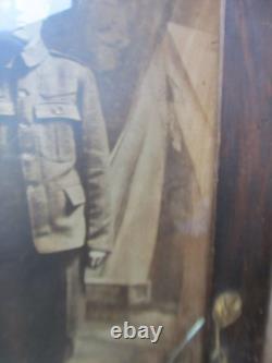 Nice Original FULL FAMILY WALL SIZE WWI PHOTO, Framed Antique Picture of WWI Soldier, Full Uniform, CAMP BACKGROUND. DESCRIPTION: Scans show it all. Early blow-up of studio photo with military background w/tents, etc. Appears to have been done shortly after the war, probably 1918 - 20.