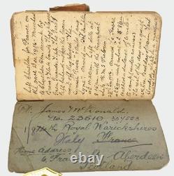 A special survival from the First World War providing a fascinating first-hand account of a soldier's experiences of war and an important historical record of the brave and vital military service provided by members of the Royal Warwickshire Regiment. Original card backed boards, 7.5cm12.2cm, 76 pages of manuscript text, ownership inscription together with regiment details and home address of Private McDonald to the front pastedown.