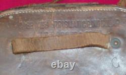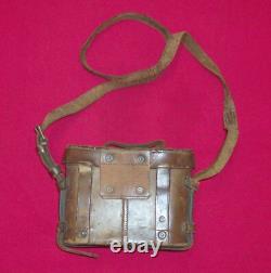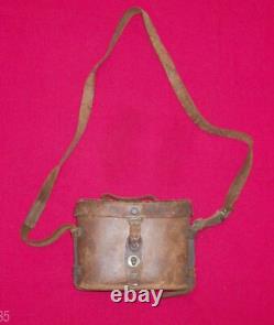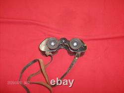 WW 1 Binoculars in leather carrying case, with shoulder strap and hand carry loop on top of case, also 2 belt passthroughs on the rear for belt if needed. On the front of the binoculars are 2 broad arrows.