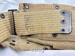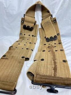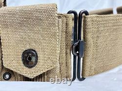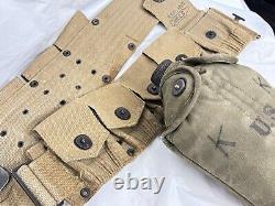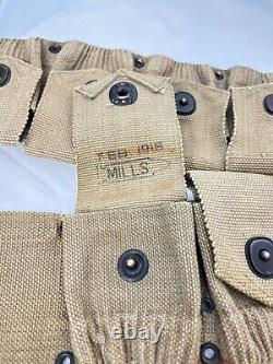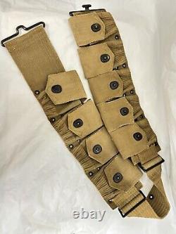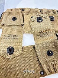 Authentic antique World War 1 and world war 2 issued field gear/military equipment. This lot comes with a rare WWII year (1918) 9 pocket MILLS Co. Woven cartridge belt in incredible condition with only a few small rust stains and one larger one on the Inside of the belt. No tears rips or missing parts.